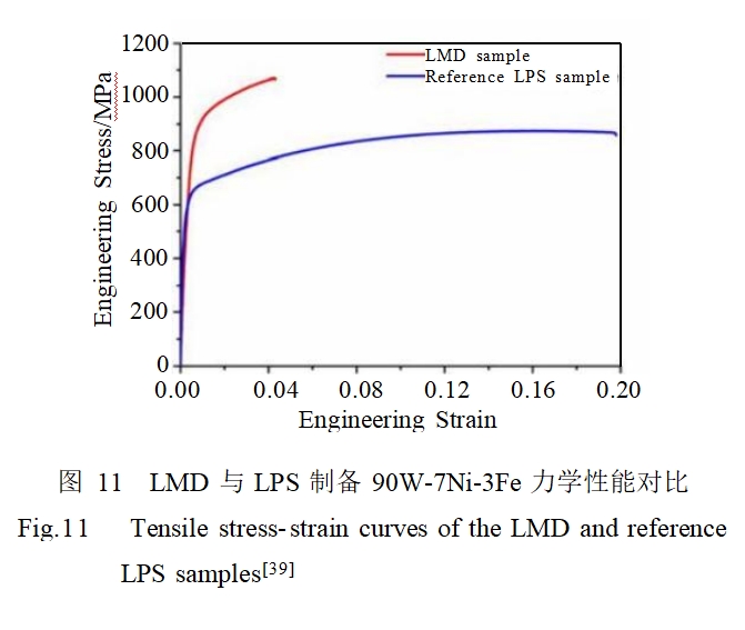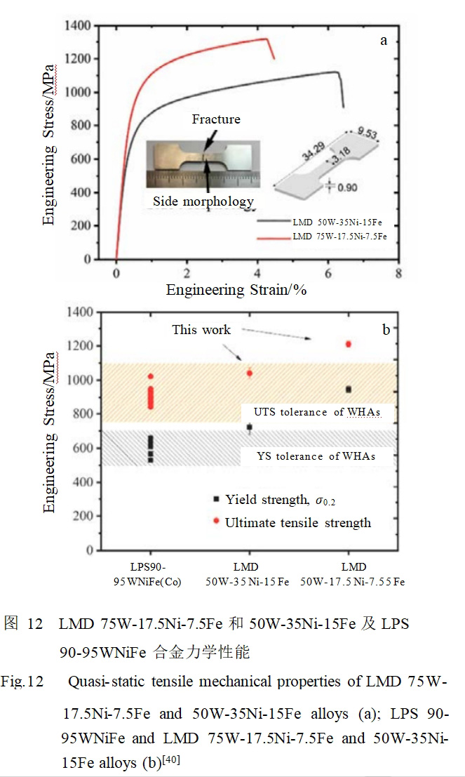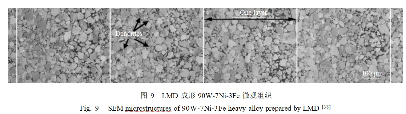 Zhou等人[40]采用LMD技术避免了传统粉末冶金制备低W含量合金时的变形与坍塌问题,实现了低W含量的75W-17.5Ni-7.5Fe合金和50W-35Ni-15Fe合金的成形,同时发现LMD方法制备的75W-17.5Ni-7.5Fe和50W-35Ni-15Fe合金具有细小均匀分布的W颗粒组织,且抗拉强度可分别达到1120和1316MPa,该强度已超过传统粉末冶金95W合金的抗拉强度,如图12所示。