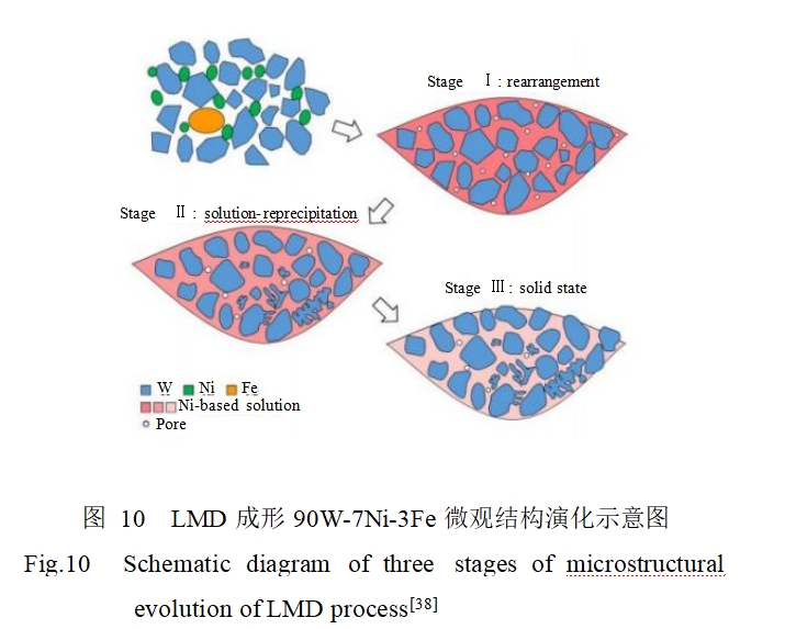 Li等人[36,37]研究了80W-20Fe合金的LMD成形,发现成形组织主要由不规则W颗粒、W枝晶、Fe7W6壳体/颗粒、Fe基粘接相组成,其中不规则W颗粒主要为未溶W粉,而W枝晶为凝固过程中从液相中析出长大的W晶体,W枝晶的含量随着输入能量密度的增加而增加,而Fe7W6相形成于非平衡冷却过程中的包晶反应;细小的W枝晶以及Fe7W6相使得合金硬度增加,整体呈现脆性。在后续研究中,Li等人[38]研究了90W-7Ni-3Fe合金的LMD成形,发现成形组织中未生成金属间化合物,同时随着输入能量密度的增加,合金中的大尺寸未熔合孔洞缺陷减少,样件致密度增加,然而在高输入能量密度下样件中依然存在着微米级的气孔,当输入激光能量密度达到74J/mm3时,可实现致密度>99%的90W-7Ni-3Fe合金的成形;同时发现由于W颗粒在微溶池中由于重力影响发生沉降,使得W颗粒沿着沉积方向呈现周期性疏密分布,如图9所示;参照传统粉末冶金LPS过程,提出了W-Ni-Fe合金在LMD过程中的类似LPS机制的组织演变过程,如图10所示。在LMD过程中,由于原始W粉部分溶解,使得成形组织中的W颗粒比原始W粉末要更圆润且尺寸更小。Y.P.Wang等人[39]对LMD和LPS制备的90W-7Ni-3Fe合金的组织与性能进行了对比研究,发现LMD合金的W-W颗粒连接度更小,粘接相中具有更高的W含量,且在W颗粒和粘接相内部具有更高的位错密度,这些特征使得LMD合金具有更高的强度(抗拉强度可达到1037MPa),如图11所示。