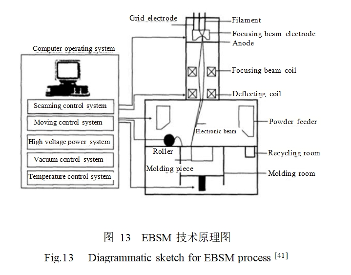 与SLM相类似,EBSM(技术原理如图13所示)的制造过程也是先在基板上平铺一层粉末,然后电子束按照预设轨迹熔化粉末,待粉末凝固后重复铺粉、熔化、凝固步骤直至零件成型。该方法也适用于小尺寸、复杂形状零件的成形,但目前关于W-Ni-Fe合金的研究报道还较为少见。