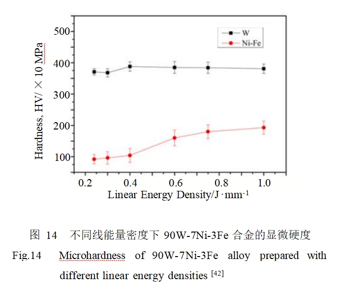 杨广宇等人[42]研究了线能量密度对EBSM制备的90W-7Ni-3Fe合金致密化的影响,发现在低的线能量密度下合金的致密化过程主要为W相粘结,随着线能量密度的增加,W颗粒重排能力提升,且在粘接相中发生溶解和析出,而能量密度进一步增加则会造成W颗粒的熔化以及Ni、Fe元素的挥发。线能量密度的增加使得W在粘接相中含量增加,由此产生固溶强化,使得粘接相显微硬度提升,如图14所示。