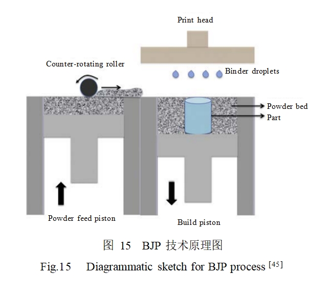BJP技术(技术原理如图15所示)的工作原理是将粉末铺散于成形平台上,通过喷射聚合物粘合剂将粉末按设定形状选择性粘合在一起,如此多层重复铺粉与喷粘合剂形成零件毛坏,再将毛坯加热以固化胶粘剂,固化后将多余的散粉去除,再进行脱蜡和烧结后处理形成最终零件[45,46]。