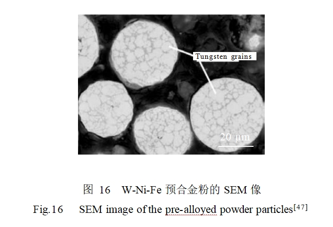 Stawovya等人[47]采用特有专利技术制备的预合金粉(如图16所示),利用BJP技术制备了成形件毛坯,再将毛坯在870℃脱蜡后在1365~1385℃下烧结2h,最终成功实现了密度为17.24g/cm3,抗拉强度为770MPa,延伸率为8.6%的91W-Ni-Fe合金制备。
