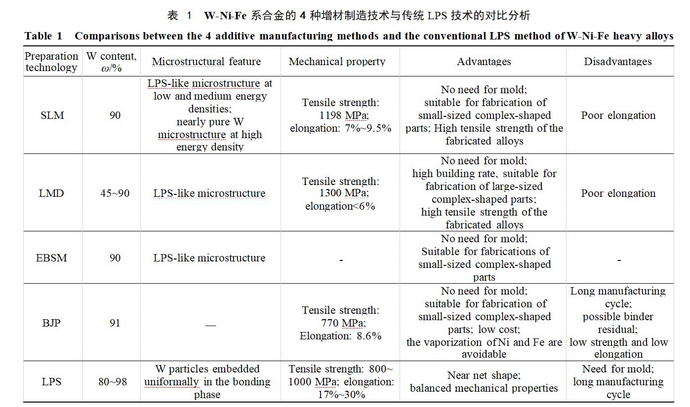 对4种W-Ni-Fe系合金增材制造技术从W含量、组织特征、力学性能、优缺点进行对比分析,结果如表1所示。