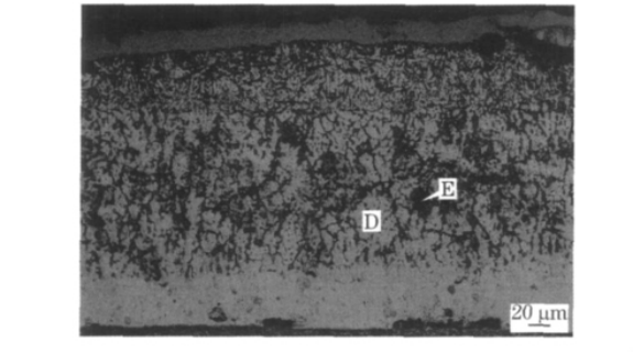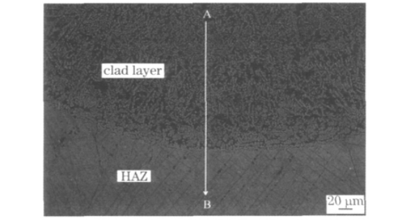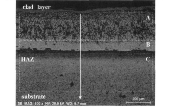 同轴送粉激光熔覆中,熔覆粉末材料在下落过程中便进入激光束开始吸收激光能量熔化,未被粉末颗粒遮挡吸收的激光能够直接照射在基材表面使其熔化,熔覆材料与基材共同形成合金熔池,凝固后形成的熔覆层与基底形成良好的冶金结合,具有更高的结合强度,基底熔深较大,基底表面向内部凹陷。熔覆层内合金成分由熔覆材料和基底材料的相互熔合扩散所共同决定,基材仅表层熔化,稀释作用有限,因而随高度不同熔覆层成分呈梯度变化。由于熔覆层是靠激光束往复运动逐层堆积形成的,必要时也可通过熔覆道搭接增加熔覆层宽度,因此同轴送粉激光熔覆在熔覆层宽度及厚度上具有较高的自由度。此外,由于激光束的往复照射,合金涂层的受热时间较长,熔池温度较单道扫描更高,熔池内部对流更加剧烈,同轴送粉法有利于形成更为细小致密的枝晶组织,熔覆层内部组织分布均匀,无明显的裂纹和气孔等缺陷,但合金元素较为集中于枝晶组织使涂层成分分布起伏较大。