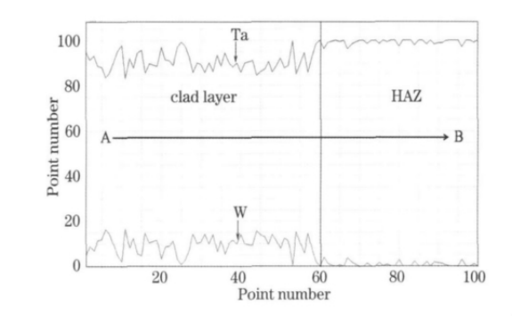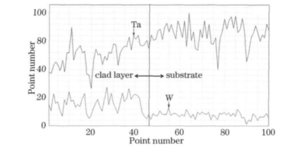 在激光熔覆过程中,首先在不送粉的情况下用激光束对基底进行预热,预热结束后开始输送粉末堆积熔覆层,此时第一道熔池深度即为基底水平面与熔覆层熔合线最下端之间的距离,熔池宽度为基底表面熔化宽度。在下一层激光熔覆时,之前凝固的熔覆层会在激光作用下再次熔化,但由于熔覆粉末的输入,一方面会吸收激光能量使照射于基材的激光能量减弱,另一方面使熔池上表面增高,在二者共同作用下前一层熔覆层会有部分再次熔化,而靠近熔池底部的部分将不会再次熔化,即熔池位置整体上升。根据图6中熔覆层内枝晶组织变化可知,靠近熔覆层搭接区域的枝晶组织在重熔作用的影响下变得较为稀疏,沿熔覆层中轴线方向各层增高高度较为均匀,表明在熔覆过程中熔池的深度并不是保持不变的,而是随熔覆层数增加逐渐减小。这是由于随熔覆层数增加,熔覆材料不断输送进入熔池,W元素得到积累,熔池内的Ta/W元素比例随之发生改变。随着熔池内W元素含量不断升高,使合金熔池熔点升高,熔池上表面升高幅度小于熔池下表面升高幅度,从而形成了熔池位置整体上升,熔池深度逐层减小的过程。