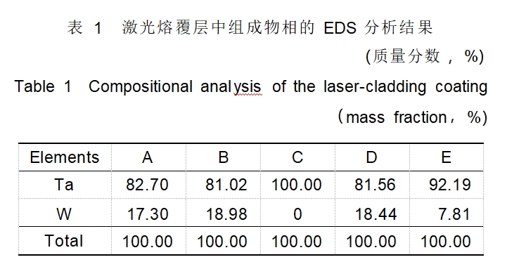 图4为熔覆层SEM显微组织照片,可以看出涂层内部组织随深度不同而有所变化。这是因为激光熔覆过程中凝固后的组织形态主要是由熔池中的温度梯度和凝固速度的比值决定的[15]。激光扫描过后,Ta-W合金熔池开始快速冷却,其底部温度梯度最大,凝固速度趋近于0,二者比率很高,此时固液界面的生长以平面的方式进行,如图4所示。随着熔池底部与基底距离的增加,温度梯度与凝固速度比值迅速减小,平界面失去原有的稳定,晶粒前沿逆热流方向生长,形成垂直于凝固方向的灰白色柱状Ta-W固溶体组织,组织中的成分组成如表1中D、E所示。在熔覆层中部柱状固溶体组织逐渐变得细小,在靠近熔覆层的顶部由于温度梯度与凝固速度比值很小,且熔池在移动激光束照射下存在强烈的对流作用,晶粒的生长失去方向性,生成无序而细小的组织。
