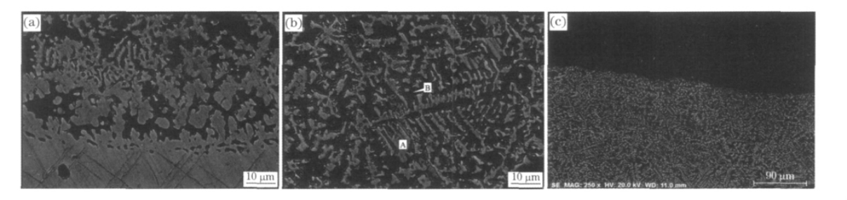 熔覆层微观组织结构如图8所示,图8(a)为熔覆层熔合线附近的显微组织,图8(b)为熔覆层内充分长大的晶粒组织,图8(c)为熔覆层顶部组织形貌。激光表面快速熔凝的过程中,在熔凝区内从底部至熔池表面,其生长速率与温度梯度不是一个常数。生长速率从熔池底部至表面逐渐增大;而温度梯度在底部为最大,然后向表面逐渐减小。在激光熔覆初始阶段,激光照射时间短,基底温度较低,温度梯度与凝固速度的比值很大,熔覆层晶粒优先形成于熔池与基材的交界面,在熔合线上方生长出灰色的团絮状组织,使熔覆层与基底间形成了牢固的冶金结合,如图8(a)所示。随着激光熔覆过程的进行,基底不断吸收热量温度升高,温度梯度与凝固速度比值减小,晶粒会逆热流方向垂直于熔合界面向熔池内部择优生长,形成致密的树枝晶组织,伴随局部能量不同和成分起伏,一些枝晶发展得较为粗大,并出现二次枝晶臂,如图8(b)所示。树枝晶长大到一定程度后受到相邻晶粒的阻碍不能继续生长,同时在激光束往复作用下,已形成的熔覆层会受到激光的二次辐照,上层部分再次熔化与新输入的熔覆材料一起重新凝固形成新一层熔覆层,靠近熔覆层搭接区域的枝晶组织由于重熔作用的影响生长方向和形态发生改变,形成较短较粗的枝晶组织,如图6中部区域所示。随着熔覆层数的增加,熔池与基体间距离的增大,温度梯度与凝固速度比值很小,同时由于远离基底,热流方向相对较为分散,使枝晶逐渐失去方向性,凝固后在熔覆层中上部得到的组织致密且较为紊乱,如图8(c)所示。对熔覆层进行各区域的EDS分析可知在熔覆层内部Ta/W元素比例并没有因为位置的不同出现明显的变化,表明熔池内的Ta和W元素充分混合。熔覆层局部区域的EDS分析结果如表2所示,图8(b)全部范围内W元素质量分数约为12%。其中A区域为灰色的树枝晶组织检测结果,W元素的质量分数约为24%,而其余黑色部分B区域W的质量分数不到1%,因此可以判断熔覆层内的树枝状组织为Ta-W固溶体,其大致均匀地分布在Ta中。