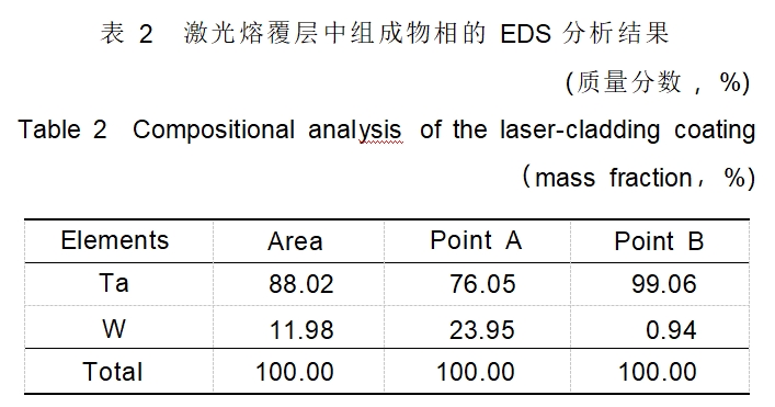 同轴送粉激光熔覆层截面形貌如图6所示。由图可以看出熔合界限向基底内部弯曲,熔覆层中心最大厚度约1mm,熔覆层与基底形成了良好的冶金结合。熔覆层中心沿深度方向由A点至B点的EDS能谱线扫描结果如图7所示,其中A侧为熔覆层,B侧为热影响区和基底。从分析结果可知,熔覆层内W元素的质量分数为5%~15%,其余为Ta。在同轴送粉激光熔覆过程中熔覆材料W粉颗粒在下落过程中经过激光束,吸收激光能量熔化,剩余的激光能量则直接照射在Ta基板上,使基材表面熔化形成熔池。熔化了的粉末液滴与部分未完全熔化的较大颗粒一起进入基底熔池与熔池混合,混合过程中未完全熔化的粉末颗粒可以吸收熔池热量进一步熔化,最终在基底表面形成含有Ta和W元素的合金熔池,熔池依靠基底的热传导以及向外界空气的辐射作用快速非平衡凝固形成熔覆层。采用同轴送粉方法,能够提高熔覆粉末与激光相互作用时间,并能够使激光能量直接作用于基底表面,有利于高熔点的熔覆材料和基底材料熔化共同形成熔池,在基材表面自生成合金涂层。由图7可以看出,熔覆层整个区域内W元素含量范围较为稳定,表明通过激光熔覆,熔覆材料与基底材料充分扩散,凝固后在基材表面形成了Ta-W合金涂层。