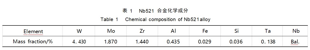 铌钨合金Nb521(Nb-5W-2Mo-1Zr)是我国自主研发的一种高温合金,其熔点高、高温(1650℃)强度好,和钨、钼及钽合金等难熔金属相比,具有密度小、常温塑性好的优势,能加工为各种复杂形状零件[1-2]。因此,Nb521一直被认为是航天飞行器、超音速飞机、导弹等优选的高温结构材料,在航空航天、核工业等领域受到广泛关注。该类合金应用于双元液体火箭发动机推力室制造,在硅化钼涂层保护下大幅提高了发动机推重比和工作温度,推力室工作温度高达约1550℃[3]。随着我国航空航天技术的迅速发展,Nb521铌钨合金的潜在应用领域更加广阔,其在各类高速飞行器高温部件中的应用逐渐受到关注[4]。为进一步拓展Nb521材料在航空航天领域的应用范围,为结构设计提供更大的发挥空间,研究Nb521合金焊接工艺和接头质量非常必要。