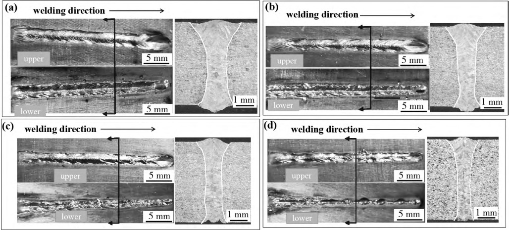 (a) 焊接速度 25 mm/s;(b) 焊接速度 35 mm/s;(c) 焊接速度 45 mm/s;(d) 焊接速度 55 mm/s