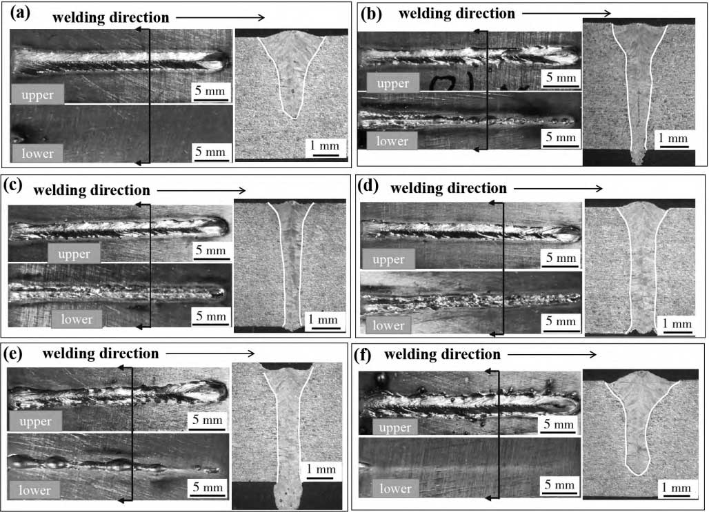 (1)随着焊接速度的增大,焊缝熔宽变小,焊缝塌陷有所改善,但焊缝连续性变差。