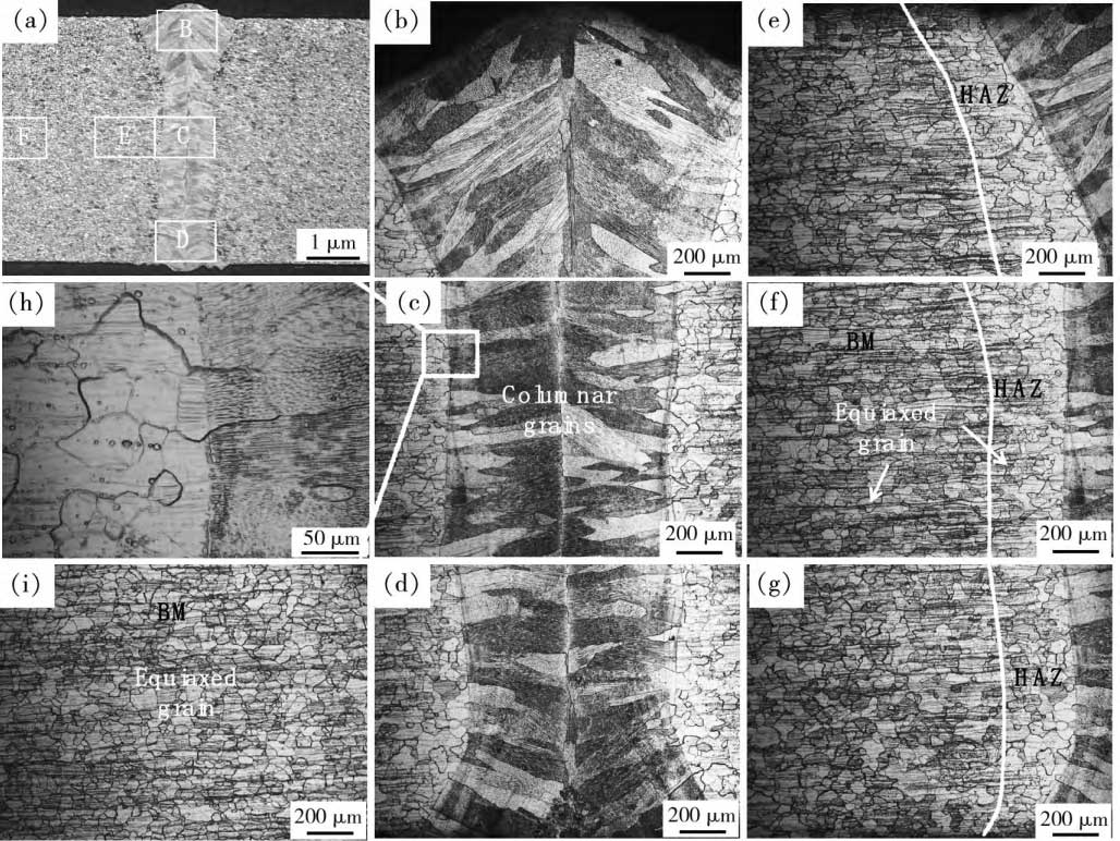 (a) 焊缝横截面;(b) 焊缝上部;(c) 焊缝 中部;(d) 焊缝下部;(e)(f)(g) 热影响 区;(h) 图(c) 的放大 图;(i) 母材
