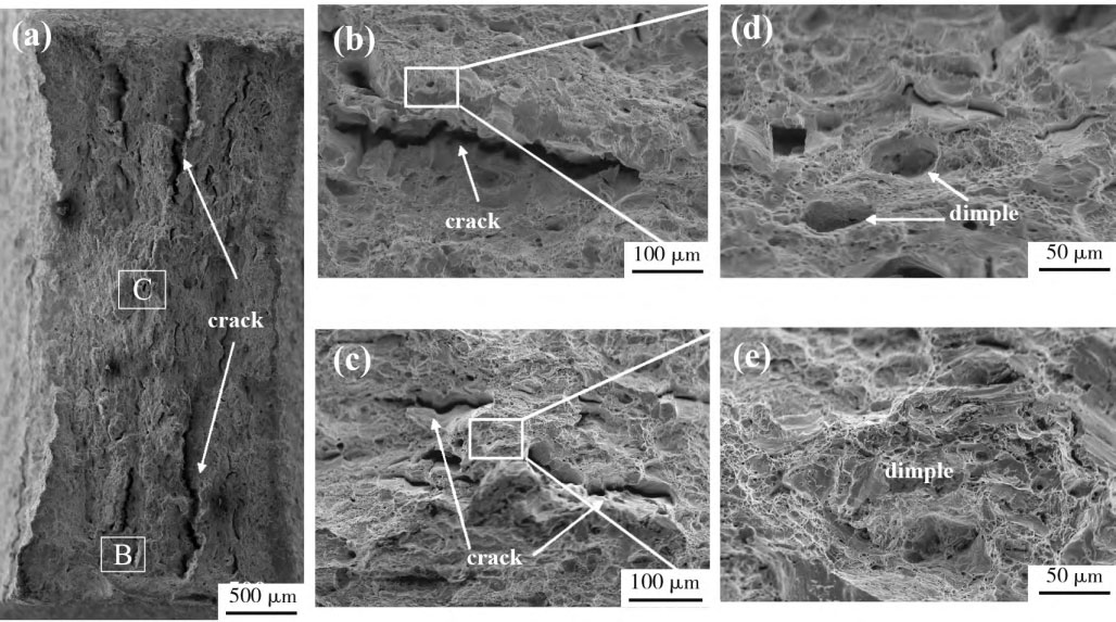 (a) 试样2整体断口形貌;(b) 在图(a) 中B 区域的放大图;(c) 在图(a) 中 C 区域的放大图; (d)图(b) 的放大图;(e) 图(c) 的放大图
