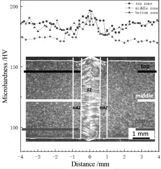 (6)焊缝区的显微硬度高于母材和热影响区的显微硬度,热影响区的显微硬度与母材硬度相当。