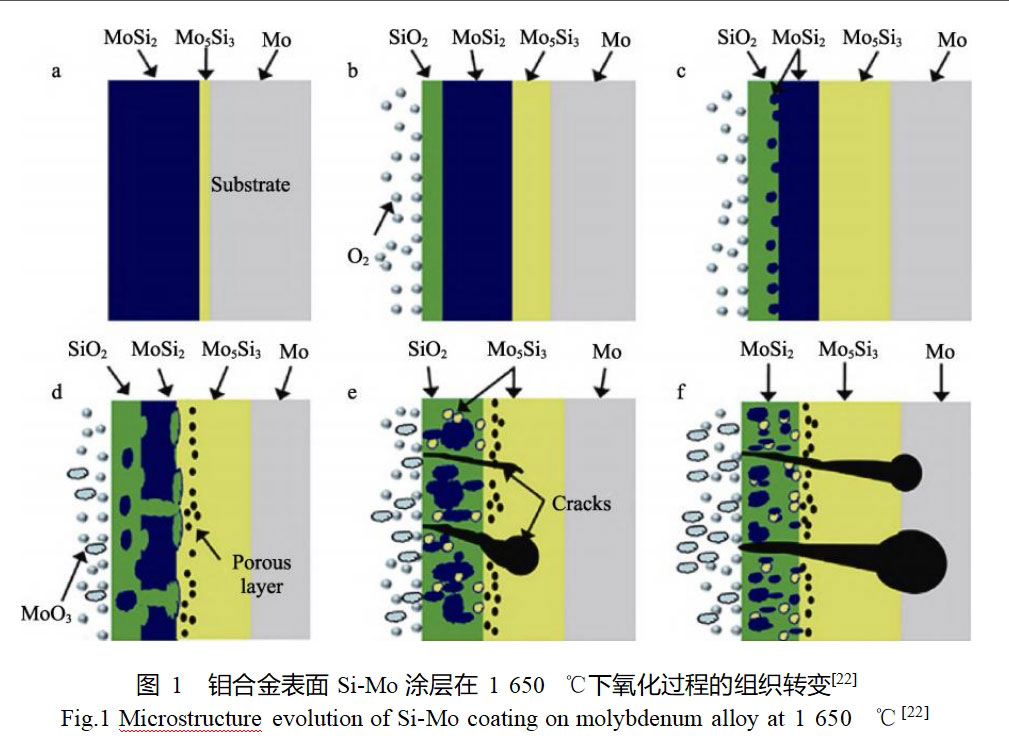 钼及钼合金具有高熔点、良好的导电导热性能、低的热膨胀系数、优异的抗腐蚀性能和高温力学性能,被广泛应用于航空航天、冶金、玻璃、电子等行业[1-4]。然而,钼及钼合金的诸多优异性能只能在惰性气氛下才能保持,这是因为它们在高于400℃的空气中氧化而引起快速质量损失和各项物理化学性能的迅速降低,因而抗高温氧化性能较差这一缺陷极大限制了钼及钼合金在高温含氧环境中的应用[5-6]。因此,研究并提高钼及钼合金的抗高温氧化性能,对于扩展其在高温材料领域中的应用有着重要的意义。