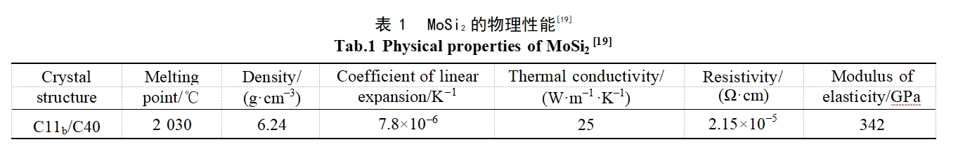 以MoSi2为代表的硅化物涂层具有较高的熔点、适中的密度、良好的热稳定性等性能,且在高温环境下能氧化形成具有自愈合功能和低氧透过性的玻璃态SiO2保护膜,展现出优异的高温抗氧化能力,因而成为钼及钼合金高温防护的理想涂层材料[17-18]。MoSi2的主要物理性能见表1。