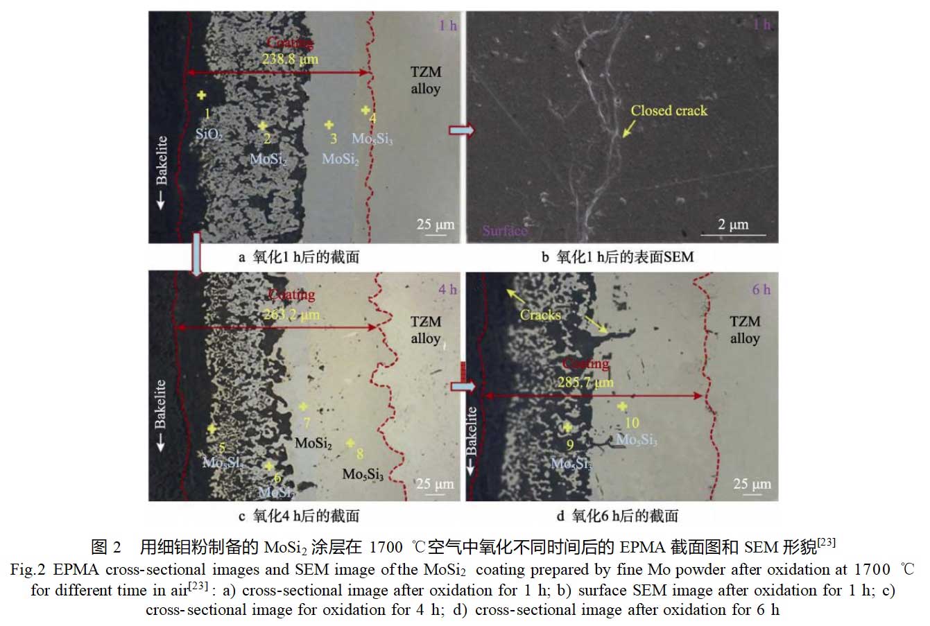 Si-Mo涂层在1650℃下的高温氧化演变过程如图1所示。随着氧化时间的延长,表面SiO2氧化膜层和界面处的Mo5Si3层逐渐变厚,而MoSi2层因同时被氧化消耗和界面扩散反应而逐渐变薄。当涂层中的MoSi2不再呈连续分布后,氧会进入涂层内部,与Mo5Si3及钼合金基体反应生成MoO3,MoO3的挥发导致涂层表面及内部形成孔洞和裂纹,最终导致涂层的失效。Pu等[23]首先采用料浆真空烧结法在TZM合金表面制备了纯钼层,随后采用卤化物活化包埋渗法,对已沉积纯钼层的合金进行渗硅处理。在制备纯钼层时,选用了2种不同粒度的钼粉作为原料,因此最终通过两步法获得2种MoSi2涂层。结果表明,2种涂层均呈现双层结构,外层为多孔的MoSi2层,内层为致密的MoSi2层。通过对比研究2种涂层在1700℃的高温氧化性能,发现由细颗粒钼粉制备的MoSi2双层涂层具有更好的抗氧化性能,对基体的保护时间可达6h。氧化后涂层呈现多层结构,从外到内分别为SiO2层、多孔MoSi2层、致密MoSi2层和Mo5Si3层,如图2所示。在氧化过程中,MoSi2逐渐向Mo5Si3转化,最终导致涂层因贫硅而发生失效。