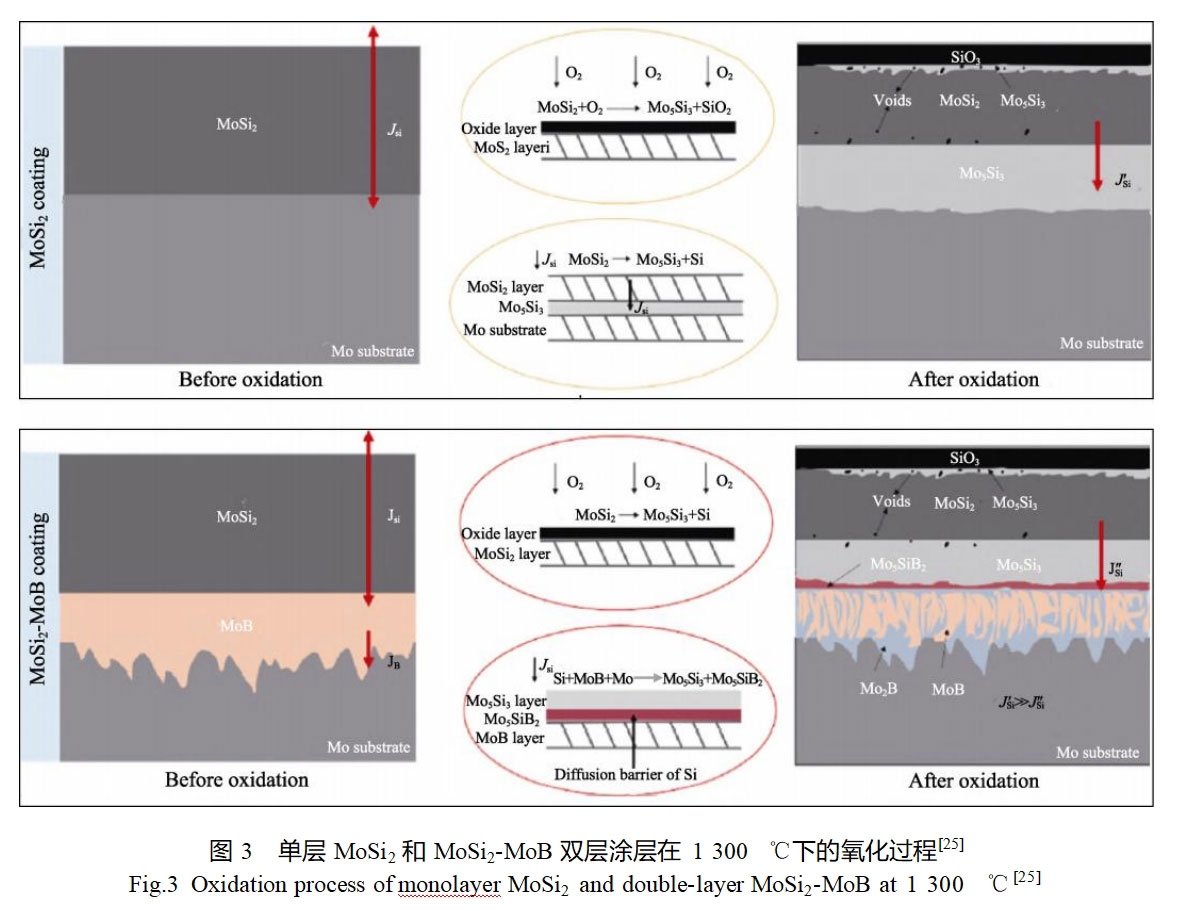 MoSi2-MoB双层涂层的优异抗氧化性能与其表面形成的SiO2氧化膜及扩散阻挡层密切相关。MoSi2氧化形成的SiO2层连续致密,且具有低氧透过率,因此可以有效延缓氧的内扩散,如图3所示。同时,氧化过程中,MoSi2层与MoB层之间的扩散反应使得界面处生成了Mo5SiB2扩散阻挡层,也能够阻碍Si向基体的内扩散。Deng等[32]利用等离子转移弧表面处理技术在钼基体表面制备了多相Mo-Si-B陶瓷涂层。涂层的微观组织由棒状Mo5SiB2枝晶、层状Mo3Si/Mo5SiB2双相共晶和胞状Mo5Si3枝晶组成。钼基体在1300℃空气中氧化10min后的质量损失已达141.2mg/cm2,而Mo-Si-B涂层氧化30h后的质量损失仅为8.2mg/cm2,可显著提高基体的抗氧化性能。Mo-Si-B涂层氧化后,可在表面形成一层连续致密的硼硅酸盐保护膜,能够作为氧的扩散阻挡层。研究还发现,涂层组织中Mo5SiB2枝晶相的抗氧化性能要优于Mo3Si/Mo5SiB2共晶相。