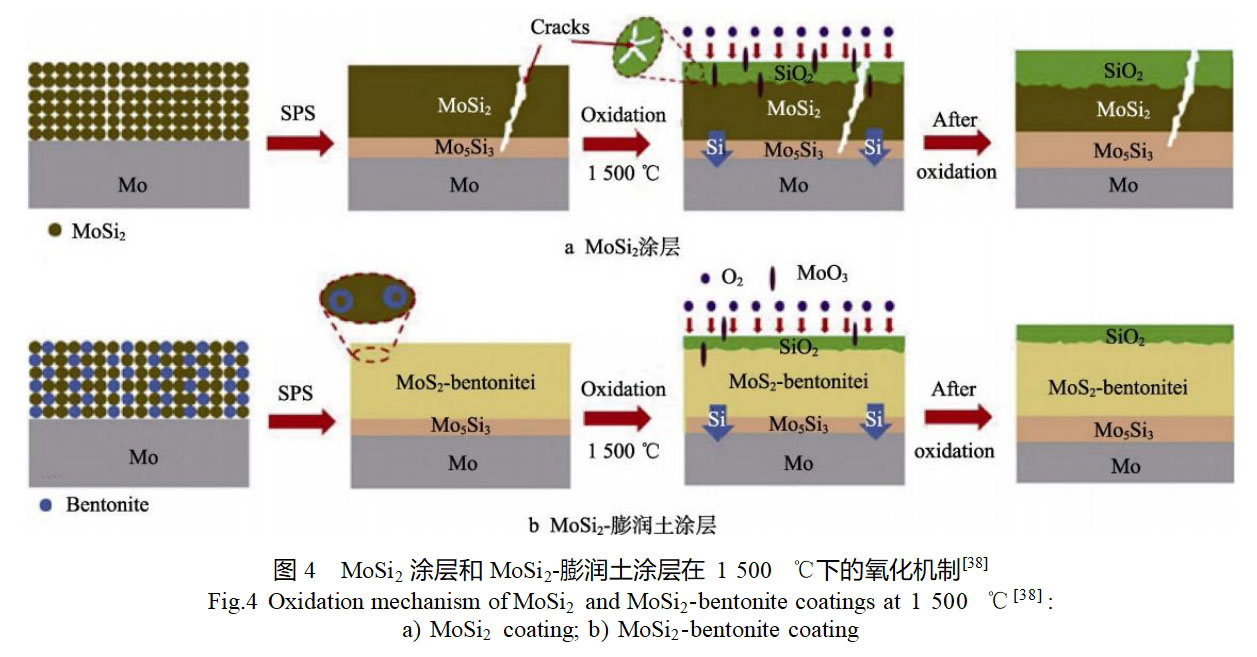 除B、Al、Ti等活性元素外,膨润土、YSZ、Si3N4等具有较低热膨胀系数的增强相也被添加到MoSi2涂层,以缓解涂层与基体间的热膨胀系数差异[38-40]。Zhu等[38]采用放电等离子体烧结技术在钼基体表面制备了MoSi2涂层和膨润土掺杂的MoSi2涂层,并对比研究了2种涂层的相组成、形貌及高温氧化性能。结果表明,两种涂层均主要由MoSi2和Mo5Si3相组成,MoSi2-膨润土复合涂层中还存在少量Al2O3相。2种涂层的结构及氧化过程如图4所示,MoSi2涂层中存在贯穿性裂纹,而MoSi2-膨润土复合涂层中无裂纹,这主要是因为膨润土可以有效降低MoSi2涂层和钼基体之间的热膨胀系数差异。与MoSi2涂层相比,复合涂层展现出更好的抗高温氧化性能,其氧化后形成的SiO2氧化膜和Mo5Si3扩散层更薄。他们[41]还以工业MoSi2废料为原料,通过三步浸涂过程依次在钼基体表面制备了由黏结层、防护层和氧扩散阻挡层组成的多层MoSi2基涂层,并在高温下对涂层进行无压烧结,同时还选用了纯MoSi2粉体原料作为对比。结果表明,利用废料制备的MoSi2基涂层没有裂纹缺陷,这主要是因为其涂层成分中含有膨润土等低热膨胀系数相,可以有效缓解涂层和基体之间的热膨胀系数差异。2种涂层在1500℃氧化20h后,以MoSi2废料为原料制备的涂层具有更低的氧化质量增量,其表面形成的SiO2氧化膜连续致密,且孔隙率较低。