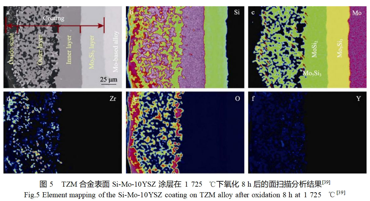 Cai等[39]采用料浆喷涂和反应烧结法在TZM合金表面制备了一种新型YSZ改性硅化物涂层,并研究了YSZ含量对涂层组织和氧化性能的影响。Si-Mo-YSZ涂层由MoSi2-ZrSi2-SiO2外层和MoSi2内层组成。1725℃静态高温氧化实验结果表明,TZM合金氧化0.35h即完全失效,而YSZ质量分数为0%、5%、10%、15%的Si-Mo-YSZ涂层对基体的防护时间分别为8.6、13.5、22.3、14.2h,证明了所有改性涂层均可有效保护钼合金基体,且Si-Mo-10YSZ涂层的抗氧化能力最佳,这主要与其表面氧化形成的氧化膜有关。Si-Mo-10YSZ涂层在1725℃氧化8h后,表面形成了致密连续的SiO2氧化膜,其中还弥散分布着一定量的ZrO2和ZrSiO4相,如图5所示。高熔点的ZrO2和ZrSiO4相有助于提高SiO2氧化膜的熔点和耐热性,且复合氧化膜的热膨胀系数要高于单一SiO2氧化膜,这可以缓解氧化膜与涂层之间的热膨胀系数差异。此外,氧在ZrSiO4-ZrO2-SiO2复合氧化膜中的透过率要低于在单一SiO2氧化膜中的透过率,因此可以降低涂层中Si的消耗速率,进而延长涂层的防护时间。Zhang等[40,42]采用三步包埋渗法在钼基体表面制备了(Mo,W)Si2-Si3N4复合涂层,并对比研究了MoSi2-Si3N4、MoSi2-CrSi2-Si3N4和(Mo,W)Si2-Si3N4复合涂层在1600℃的高温氧化性能。结果表明,(Mo,W)Si2-Si3N4复合涂层与基体结合良好,涂层组织呈柱状晶结构,在1600℃氧化360h后才开始出现加速质量损失的现象,其对钼基体的氧化防护时间分别为MoSi2-CrSi2-Si3N4涂层和MoSi2-Si3N4涂层的3.75倍和5倍。在氧化过程中,(Mo,W)Si2-Si3N4复合涂层表面形成了SiO2氧化膜,涂层与基体间形成了(Mo,W)5Si3和(Mo,W)3Si过渡层。硅化物基涂层的服役寿命与其氧化形成的Mo5Si3过渡层密切相关,因此他们还对比研究了3种涂层在1600℃氧化过程中(Mo,W)5Si3或Mo5Si3层的生长速率。3种涂层中过渡层的厚度变化均遵循抛物线规律,且(Mo,W)Si2-Si3N4涂层过渡层的生长速率常数最低,证明了W元素的引入对Si在涂层与钼基体之间的扩散有较强的阻碍作用。