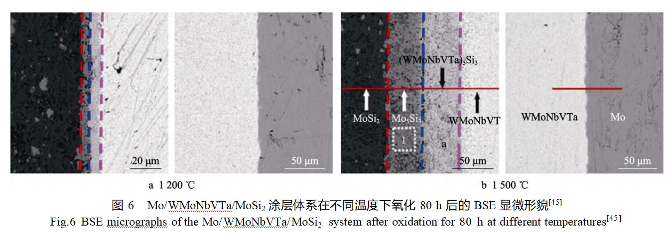 涂层结构设计主要是通过涂层成分的梯度变化或扩散阻挡层的制备来缓解涂层与基体间的热膨胀系数差异,并抑制活性组元在涂层与基体间的扩散。Liu等[43]采用两步包埋渗法在钼基体表面原位制备了MoSi2/SiC-Mo2C梯度复合涂层,即先在石墨中对钼基体进行渗碳以获得Mo2C层,然后将带有Mo2C层的钼基体在硅粉中进行渗硅,以获得MoSi2/SiC层。他们同时研究了复合涂层和单一MoSi2涂层在不同温度的循环氧化行为,并讨论了Mo2C阻挡层对涂层抗氧化性能的影响。结果表明,复合涂层和单一MoSi2涂层在500℃氧化100h均没有发生“pest”氧化;在高温(1200、1400、1600℃)下复合涂层的抗氧化性能均优于单一MoSi2涂层。MoSi2/SiC-Mo2C复合涂层中的SiC相能够减缓MoSi2涂层和钼基体间的热膨胀系数差异,同时Mo2C阻挡层在减缓C和Si向钼基体扩散的过程中起着关键作用,因而复合涂层具有更好的抗氧化性能。在MoSi2/SiC-Mo2C复合涂层基础上,Jiang等[44]采用三步包埋渗法在钼基体表面成功制备了CrSi2/MoSi2/SiC-Mo2C梯度复合涂层,涂层外层由CrSi2、MoSi2和SiC组成,内层为Mo2C层。通过与MoSi2/SiC-Mo2C涂层体系进行对比,重点讨论了复合涂层中Cr元素对抗氧化性能的影响机制。结果表明,2种涂层在500℃的抗氧化能力接近,而在1600℃温度下,CrSi2/MoSi2/SiC-Mo2C涂层呈现出更好的抗氧化性能。涂层中Cr元素氧化形成的Cr2O3不仅可以缓解涂层与基体间的热膨胀系数差异,同时有助于加速混合保护性氧化膜在低温的形成。此外,氧化膜中的Cr2O3还可在高温下抑制SiO2的挥发,提高玻璃态氧化膜的稳定性。Yan等[45]研究了WMoNbVTa高熵合金扩散阻挡层对钼基体表面MoSi2涂层高温氧化性能的影响。他们采用放电等离子体烧结法在钼基体表面制备了双层涂层,内层为WMoNbVTa层,外层为MoSi2层,并对比研究了Mo/WMoNbVTa/MoSi2和Mo/MoSi2涂层在1200~1500℃的互扩散行为。长时间氧化后,在WMoNbVTa/MoSi2界面处出现了Mo5Si3和(WMoNbVTa)5Si3等2个扩散层,而在Mo/WMoNbVTa界面处没有出现明显的扩散层,如图6所示。扩散层在Mo/WMoNbVTa/MoSi2涂层中的生长速率要远低于其在Mo/MoSi2涂层中的生长速率,证明了WMoNbVTa高熵合金层可以有效抑制钼基体和MoSi2涂层间的元素互扩散。