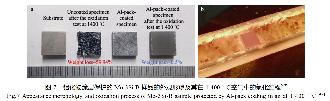 Chakraborty等[46]采用包埋渗法在TZM合金表面制备了铝化物涂层,研究了渗剂组成和反应温度对涂层质量和厚度的影响。在1000℃反应12h后,可在TZM合金表面获得厚度为50μm的双层结构铝化物涂层,其物相组成为Al5Mo、Al7Mo4和Al2(MoO4)3。铝化物涂层在1000、1200℃氧化初期,其质量均因Al2O3的生成而快速增加,随后氧化速率因保护性Al2O3氧化膜的形成而变缓慢。Choi等[47]以NH4Cl、Al和Al2O3为原料,采用包埋渗法在Mo-3Si-1B钼合金表面制备了铝化物涂层,并研究了涂层的生长动力学和等温氧化行为。铝化物涂层由MoAl4、Mo3Al8及弥散分布的沉淀相组成。他们根据在800、900、1000℃温度下,不同包埋渗处理时间的实验结果,估算出铝化物涂层生长的平衡速率常数k0和活化能Q,并建立了涂层生长动力学模型。通过模型估算出的涂层厚度与实验结果基本相符,证明了模型的合理性。同时对比了Mo-3Si-1B基体和铝化物涂层在1400℃空气中的高温氧化性能,如图7所示。基体氧化5h后,质量损失达59.94%,而涂层氧化36h后,仅有0.5%的轻微质量增量,其优异的抗氧化性能主要与氧化形成的保护性α-Al2O3氧化膜有关。Park等[48]对比研究了TZM合金和带有铝化物涂层的TZM合金在动态等离子火焰下的高温氧化性能。铝化物涂层由包埋渗法制成,其厚度约为200μm,主要由Al3Mo和Al8Mo3相组成。TZM合金在动态等离子火焰环境中暴露4min后,质量损失达80%;而铝化物涂层样品经8min、30s火焰烧蚀后,质量几乎没有变化,同时涂层的厚度也没有发生改变。因此,铝化物涂层具备在动态高温氧化环境中服役的可能性。