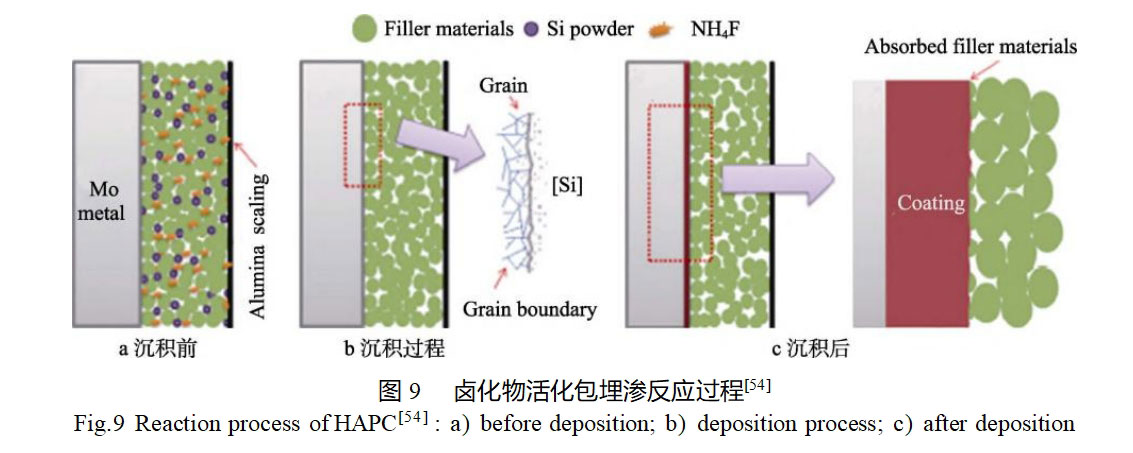 Sun等[54]采用卤化物活化包埋渗法制备了MoSi2涂层,并研究了不同填料(Al2O3、SiO2、SiC)对涂层微观结构和抗氧化性能的影响。卤化物活化包埋渗过程是发生在基体表面的原位扩散反应涂层制备过程,如图9所示。在加热过程中,作为活化剂的NH4F与包埋粉末中的高纯硅粉反应生成气态SiFx(1<x<4),SiFx通过粉末间隙被传输至基体表面,并在基体表面发生分解反应,生成活性原子[Si]。随后,活性原子[Si]在基体表面发生吸附,并与基体发生扩散反应,生成硅化物。[Si]的渗入导致涂层表面具有更高的表面能,因此在冷却过程中填料被吸收入涂层中。结果表明,由Al2O3和SiO2填料制备的涂层呈现出由外层MoSi2和内层Mo5Si3组成的双层结构,而由SiC填料制备的涂层仅由MoSi2构成。由SiO2填料制备的涂层表面较粗糙,且与Al2O3或SiC填料制备的涂层相比,有更多的残余SiO2填料嵌入在涂层表面。在500℃温度氧化110h后,3种涂层均表现出良好的抗氧化性能,能够有效保护钼基体抵抗“pest”氧化。在1200℃高温氧化110h后,由SiO2填料制备的涂层表现出最好的抗氧化能力,质量变化仅为0.05%。