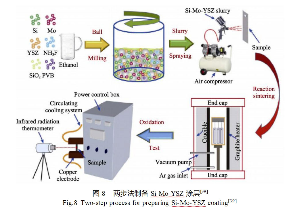 料浆烧结法是将渗源和黏结剂、活化剂、溶剂等其他添加剂按照一定比例球磨混合制成料浆,然后将料浆喷涂或刷涂于基体表面并干燥,随后将其置于真空或惰性气氛保护下进行高温烧结,最终获得所需要的涂层[52]。料浆烧结法具有成本低、工艺简单、涂层与基体结合紧密的优点,但涂层厚度的可控性较差。 Cai等[39]采用料浆喷涂和反应烧结两步法在TZM合金表面制备了Si-Mo-YSZ涂层。涂层制备过程如图8所示,首先将原料硅粉、钼粉、YSZ粉以及少量的NH4F、SiO2和PVB分散至乙醇溶剂中,经球磨处理后获得料浆,并用空压机和喷枪将料浆喷涂至TZM合金基体表面。待料浆干燥后,将表面涂覆料浆的TZM合金置于真空烧结炉中,先升温至500℃,并保温1h,以除去水分和PVB,再在1450℃保温烧结1h。烧结过程中,料浆中的熔融态Si与Mo及ZrO2发生化学反应生成MoSi2、ZrSi2和SiO2,构成涂层的主要成分。肖来荣等[52]采用料浆烧结法在钼合金表面制备了MoSi2-ZrB2高温抗氧化涂层。浆料是以MoSi2、ZrB2和自制的烧结剂按一定比例混合,再加入乙醇、黏结剂球磨10h制得。将浆料涂覆于基体表面,置于真空干燥箱干燥2h,然后在1580℃下真空烧结30min。涂层表面主要为MoSi2、ZrB2和少量SiC,涂层致密均匀,且无明显缺陷,厚度约为100μm。涂层在1670℃静态空气中的抗氧化寿命可达12h。