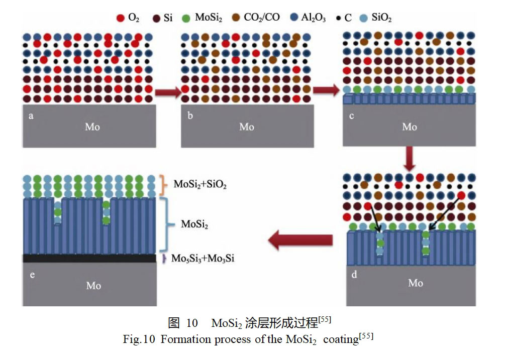 传统包埋渗通常是在真空或惰性气氛保护下进行的。Yang等[55]对包埋渗工艺进行了改进,通过在填料中加入炭粉使其消耗环境中的氧,实现了大气条件下钼基体表面MoSi2涂层的原位制备。MoSi2涂层的形成过程如图10所示。在初期加热阶段,渗剂中的炭粉与氧反应生成CO或CO2,降低了体系中的氧分压,但是氧没有被完全消耗。随着MoSi2的不断生成,少量的残余氧能够与MoSi2反应生成SiO2,后者可以填充至涂层间隙中,从而有利于形成更致密的涂层。研究发现,所制备的MoSi2涂层具有优异的抗氧化性能,在1600℃高温氧化1h后,涂层仍然保持完整,表面氧化形成的玻璃态SiO2层可以有效保护下方涂层和基体。