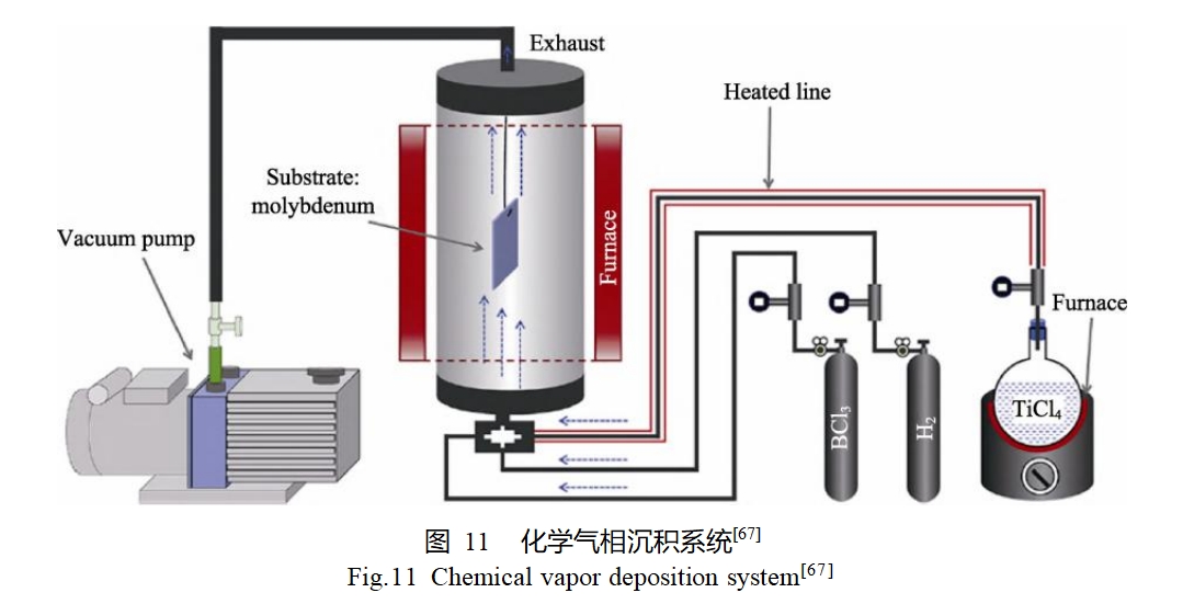 Huang等[67]利用CVD法在钼基体表面制备了TiB2陶瓷涂层。制备过程如图11所示,将钼基体置于沉积室中央,气态TiCl4、BCl3和H2前驱体分别经过进口管路通入沉积室中。沉积压力控制在40~50kPa,温度为1000℃,反应过程中,TiCl4和BCl3被H2还原为TiB2。沉积2h后,TiB2涂层的厚度可达13μm,涂层呈典型的柱状晶结构,且与基体结合良好。Yoon等[68]总结了利用CVD法在钼表面制备MoSi2涂层的反应机理,以SiCl4和H2为反应气体,反应分为以下4个步骤:反应气体通过气体边界层从主气流到基体表面的传质;气体分子被吸附在基体表面,并在表面沉积Si的反应;Si向基体的固态扩散;Si与Mo基体反应生成MoSi2。