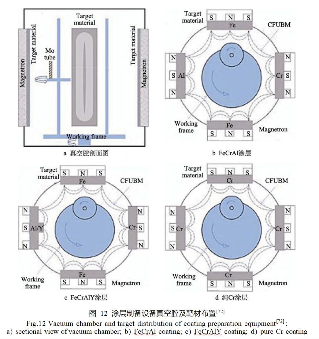 李婷婷[72]采用磁控溅射技术在钼合金表面分别制备了FeCrAl、FeCrAlY和纯Cr涂层。磁控溅射装置及靶材布置示意图如图12所示。通过对不同靶材的靶电流进行调控,可以控制Fe、Cr、Al、Y等元素的入射粒子流密度,进而实现对涂层中各组分含量的控制。3种涂层厚度相近,截面形貌均呈现典型的柱状晶结构。FeCrAl和FeCrAlY涂层主要由FeCr固溶体组成,故硬度大于纯Cr涂层,而纯Cr涂层与基体的结合强度优于另2种涂层。Lange等[69]采用磁控溅射和后续退火相结合的技术,在Mo-9Si-8B合金表面制备,3种Mo-Si-B双层涂层。首先采用Mo靶和SiB2靶,在–30V偏压、108℃条件下,在基体表面沉积了2μm厚的非晶Mo-12Si-28B层,并将Mo-12Si-28B层在900℃真空炉内退火处理2h,以获得Mo5SiB2层。随后,在退火层表面磁控溅射4种不同成分的Mo-Si-B涂层。SiB2靶、Si靶、Mo靶和B靶被用于制备Mo-55Si-10B和Mo-29Si-15B涂层,SiB2靶、Mo靶和2个Si靶被用于制备Mo-45Si-25B涂层。经真空处理后,4种外涂层发生晶化转变,生成MoSi2、Mo5Si3和MoB相。