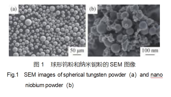 钨作为一种重要的难熔金属材料,因其高熔点、高导热系数、低蒸气压、耐辐照损伤等特点,在众多领域具有重要的应用,被认为是最有前途的聚变反应堆用候选材料之一[1-7]。然而,由于纯钨材料存在低温脆性、再结晶脆性、辐照脆性以及高温力学性能较差等问题,限制了其在许多领域的应用。通常采用固溶强化、氧化物弥散强化、细晶强化等方式对钨的性能进行调控[3-4]。研究表明,在钨中加入铌可以通过固溶强化有效地改善钨的室温和高温力学性能[8-9],铌的掺杂同时对钨的氢同位素行为也有重要的影响[10-11],因此W-Nb合金在核工业领域具有一定的应用潜力。传统W-Nb合金多采用粉末冶金方法制备,结合后续的热加工和焊接等过程。增材制造技术(又称3D打印技术)是一种以逐层叠加的方式制造物体的过程,适用于复杂金属结构的直接成形,为钨基材料复杂构件的成形提供了新的途径[12-13],可解决传统粉末冶金过程流程长、难以成形复杂结构的问题。其中的粉床型增材制造过程是将金属粉末铺展在平面上,形成一层厚度为20~100μm的粉层,然后根据三维结构的切层信息进行选择性熔化,逐层累积成形,多余的粉末将被回收后重复使用[14]。粉末的化学成分、粒度分布、流动性、松装/振实密度、形貌等都会影响最终成形样件的质量。粉床型增材制造过程对粉末的要求主要包括以下几个方面:1)粉末具有良好的流动性、铺展性以满足单层粉末的铺展过程;2)粉末具有良好的均匀性,稳定性,保证每层粉末一致性;3)多次使用后粉末性能稳定,可重复使用。一般来说,球形预合金粉末是粉床型增材制造技术的最佳选择[15]。常规的制备方式主要包括气体雾化法(GA)、等离子体旋转电极法(PREP)等。但是由于钨基材料的熔点较高,预合金粉末的制备难度较大。球磨法是物料在机械力的作用下发生混合或合金化的过程,制备流程简单、成本低、适用性广。因此,本文采用机械球磨的方法,以球形钨粉和纳米铌粉为原料,制备了增材制造用W-Nb复合粉末,并采用粉床型电子束增材制造(SEBM)技术对粉末的适应性进行验证。