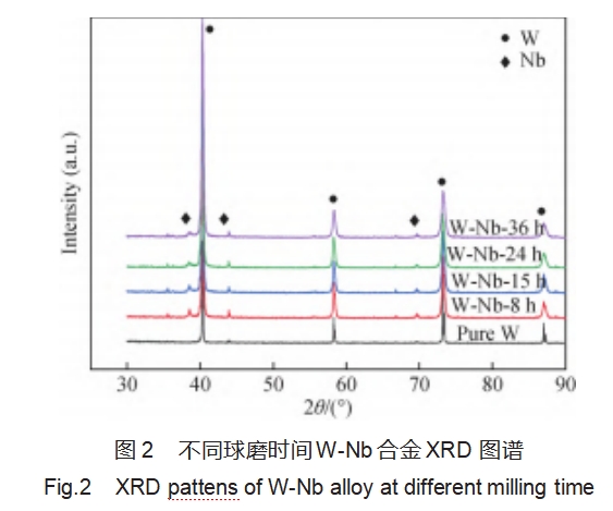 图2为不同球磨时间下W-Nb复合粉末的XRD图谱,可以看出W-Nb复合粉末中同时存在钨、铌相,钨铌两种元素之间没有完全发生固溶反应。钨的衍射峰随着球磨时间的延长逐渐宽化,同时,当球磨时间达到36h时,衍射峰值开始向高角度偏移。因为铌元素含量较低,其衍射峰随球磨时间变化不明显。
