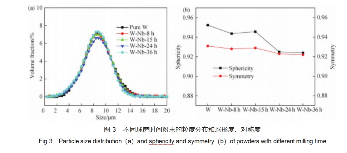 1.通过机械球磨可以将纳米铌粉均匀分散并吸附在微米级球形钨粉表面,形成包覆型复合粉末。通过对粉末形貌、粒径分布、球形度、内部塑性变形的分析得出最佳球磨工艺,获得适用于增材制造过程的W-Nb复合粉末。