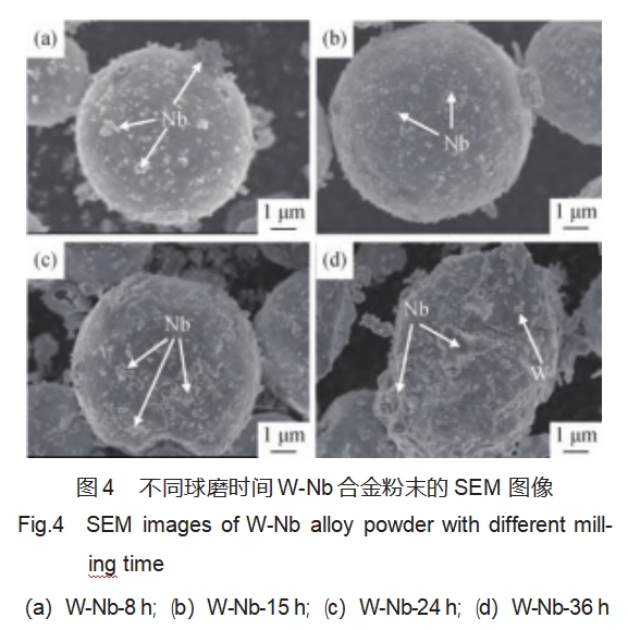结合不同球磨时间W-Nb复合粉末的表面形貌(图4),可以看出球磨时间为8h时,由纳米粉末颗粒较小,表面能较大,粉末之间仍有较明显的吸附团聚现象;当球磨时间为15h时,球形钨粉并未发生明显变化,纳米铌粉充分分散,并均匀分布在球形钨粉表面;继续增大球磨时间钨粉表面开始出现变、破损,钨粉表面的铌粉发生一定的粘结;当球磨时间达到36h时,球形钨粉破损严重。