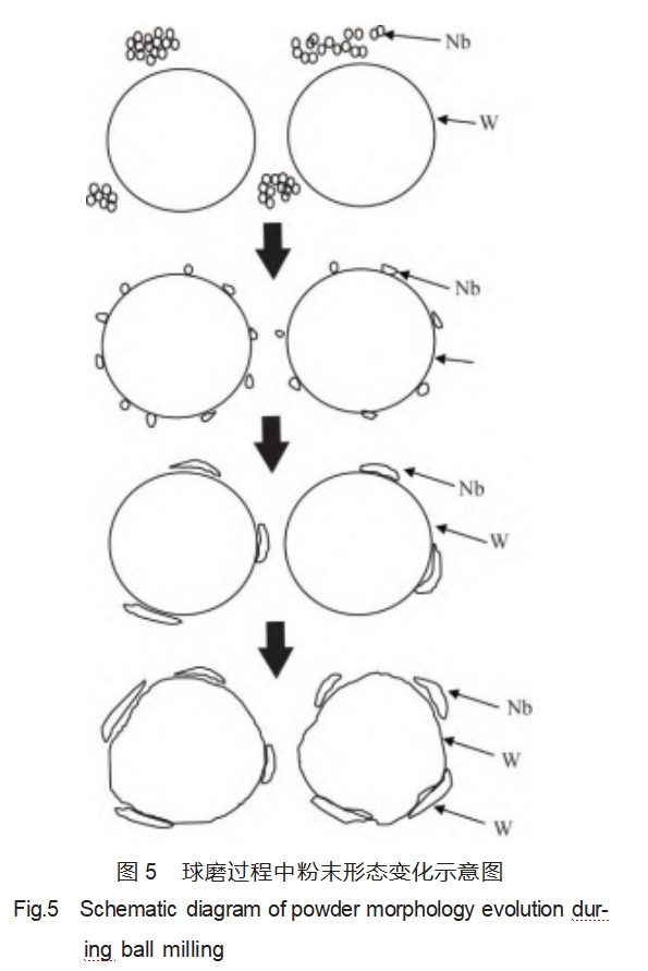 机械球磨过程主要为磨球与磨球之间的剧烈摩擦和高速碰撞,使磨球之间的粉末颗粒被循环往复的冲击、剪切、压缩。本文中采用的两种元素一种为微米级的脆性钨粉,一种为纳米级的塑性铌粉。所以二者球磨的过程中表现出明显的不同尺度、不同特性两种混合粉末球磨的特点,脆性粉末与塑性粉末表现出不同的特征变化。随球磨时间增大,塑/脆两种粉末的变化过程如图5所示。