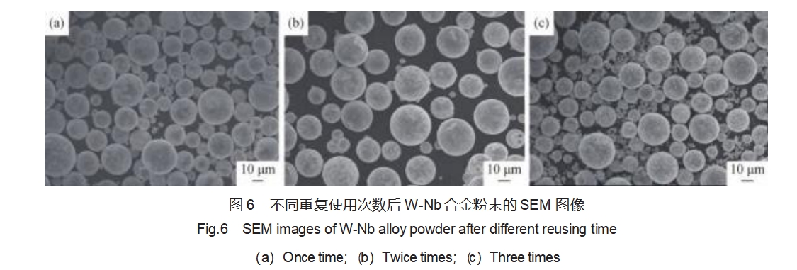 结合上述分析,球磨15h后W-Nb复合粉末的综合性能最佳。采用SEBM技术对该粉末进行成形性验证,结果表明:粉末的流动铺展性好,满足成形过程要求。图6为不同重复使用次数后W-Nb合金粉末形貌,可以看出纳米铌粉和球形钨粉之间的吸附强度可避免在粉末铺展过程中发生不同密度粉末的团聚、分层现象。循环使用3次后,粉末仍保持吸附状态(图6(c)),流动性、均匀性等仍满足成形过程要求。