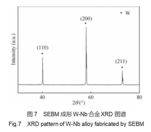 W-Nb二元合金为无限固溶合金体系,铌与钨具有相同的体心立方(bcc)结构,传统W-Nb合金采用粉末冶金方法制备,铌元素含量的增大可提高扩散致密化的能力,二者通过相互扩散来实现致密化,通常会在界面处形成一个扩散层,在晶界处会形成富铌第二相[11,16]。图7为粉床型电子束增材制造W-Nb合金的XRD图谱,可以看出,合金中仅存在钨的衍射峰,这主要是由于电子束与粉末相互作用进会形成细小熔池,熔池冷却速度极快,在短时内铌与钨元素形成了单一的bcc钨固溶体。