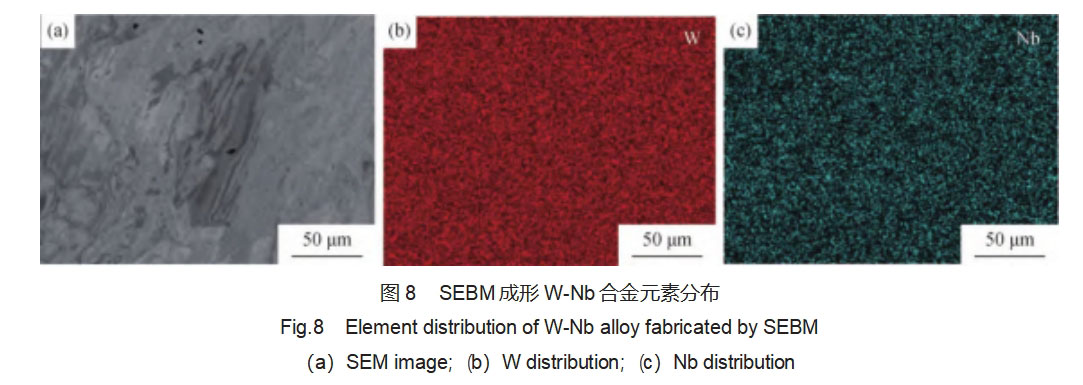 图8为W-Nb合金内部元素分布情况,因为忽略二种元素之间的相互扩散作用,合金中并未生成富铌第二相。表1为粉末原料和粉床电子束增材制造W-Nb合金的化学成份,可以看出,成形后样品的O,Nb元素的含量略有降低,主要是由于纳米铌粉吸附了一定的氧,在粉床电子束成形的高温环境下少量的吸附氧被去除,同时,Nb元素在高温熔池内部有少量的挥发。