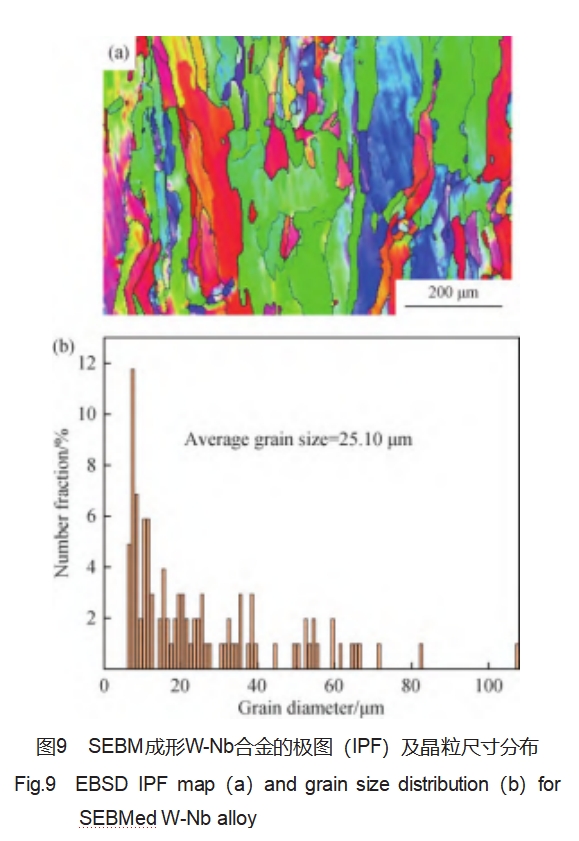 图9(a)为SEBM成形W-Nb合金显微形貌,可见合金沿成形方向形成典型的柱状晶组织。增材制造是一个逐线逐层累积生长的过程,存在沿着扫描线和成形方向的显著的热传导作用。所以,晶体无法实现自由生长,多为强制型生长,即首先在底板上形核,此时晶体取向是随机的,在逐层累积的过程中,部分晶粒取向和传热方向平行的晶粒会快速的沿成形方向外延生长形成柱状晶。晶粒平均尺寸为25.10μm,晶粒分布如图9(b)所示,由于钨与铌元素之间形成了连续固溶体,因为铌的原子尺寸与弹性均与钨相差较大,可通过固溶方式调整钨的晶体结构,增强了原子键合力和晶格畸变,增大位错滑移的阻力,从而达到改善钨基合金强度的目的。