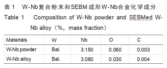 以球磨后的W-Nb复合粉末为原料,采用西安赛隆金属材料有限公司S2粉床型电子束增材制造设备成形出尺寸为10mm×10mm×