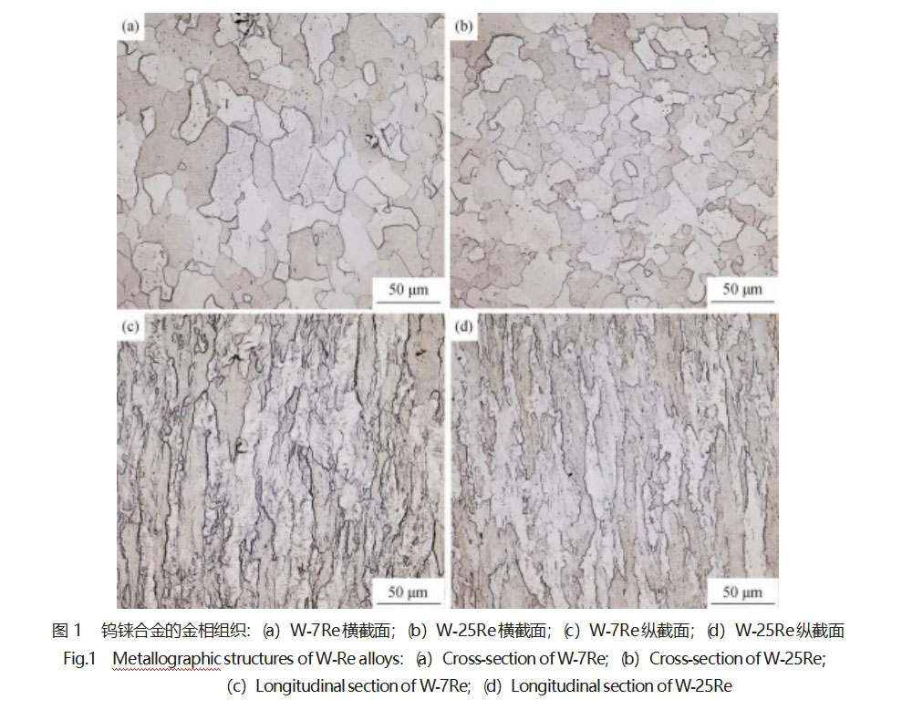 采用粉末冶金法制备了两种不同铼含量的钨铼合金,分别为W-7Re(质量分数)和W-25Re(质量分数)。制备过程如下:首先,按比例称取纯度为99.95%、费氏粒度为3.5μm的钨粉和纯度为99.99%、费氏粒度为5μm的铼粉,再采用全方位行星球磨机将它们在氩气气氛中球磨混粉。在球磨过程中,转速控制在300r/min,球料比为3∶1,球磨时间为8h。随后,在250MPa的压力下,将球磨后的合金粉末装入胶套,在冷等静压机中生坯成型。接着,将压制好的生坯放入高温烧结炉内,在2300℃下进行致密化烧结。之后,采用旋锻机对烧结后的钨铼合金熟坯进行旋锻加工,控制变形量为70%。最后,将加工好的钨铼合金放入退火炉,经1100℃×1h退火处理,随后进行金相组织观察和性能测试。