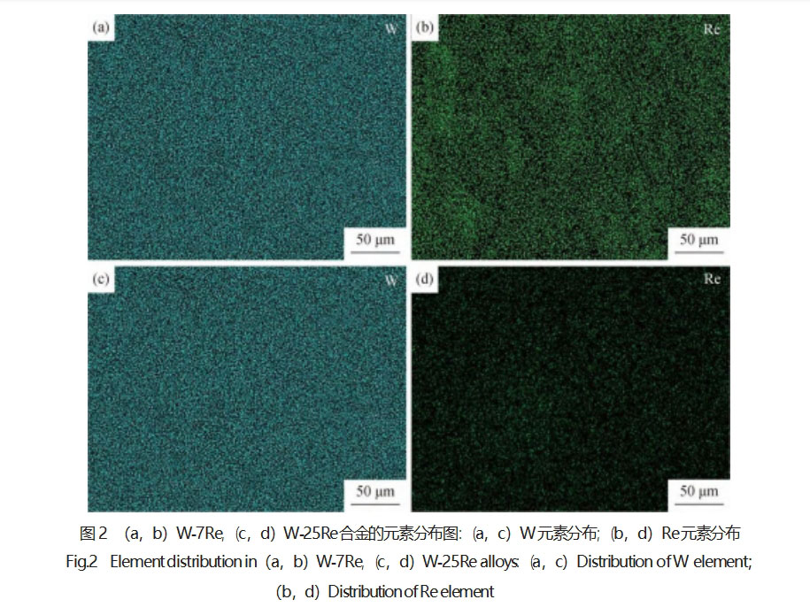 图1展示了W-7Re与W-25Re合金的横、纵截面金相组织。观察发现,不同铼含量钨铼合金的内部组织均呈现出极高的致密性,基本观察不到孔洞的存在。对比图1(a,b),可清晰看出W-25Re合金的晶粒尺寸明显小于W-7Re合金,这一观察结果有力地证明了Re元素具有细化钨铼合金晶粒的作用,并且Re含量越高,这种细化作用越显著。这一现象与采用热压烧结和放电等离子烧结方法制备钨铼合金时所观察到的现象高度一致[15]。通过观察图2中的元素分布图,可以明显看出,在两种不同铼含量的钨铼合金中,Re元素都呈现出均匀分布的状态,没有出现明显的偏析富集区域,这一现象表明,Re元素主要固溶在W基体之中。进一步对比发现,W-25Re合金中的Re元素分布图相较于W-7Re合金显得更为富集明亮,也进一步佐证了W-25Re合金中的Re含量更高。Re对W晶粒的细化作用主要归因于Re固溶后会置换W原子在晶格中的位置,并有效抑制W在高温下的扩散行为,从而显著延缓W晶粒的长大过程[16]。对比分析图1(c,d),可以发现两种铼含量的钨铼合金纵截面晶粒均呈现出明显的纤维状形态,这是旋锻加工过程中材料变形所导致的。这种纤维状晶粒结构对于提高合金的强度和韧性具有积极作用。