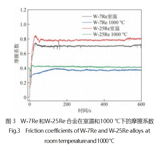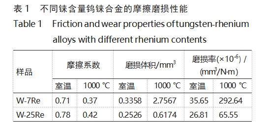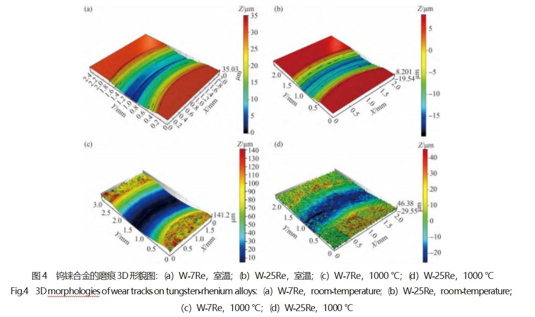 3)钨铼合金的耐磨损性能随铼含量的增加而提升。W-25Re合金在室温和高温环境下的耐磨损性能均优于W-7Re合金。