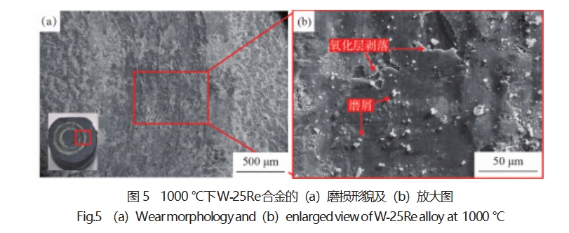 进一步对W-25Re合金在1000℃高温条件下的磨损形貌进行表征,结果如图5所示。可以看出,W-25Re表面存在明显的氧化层剥落和釉质层生成现象,磨损形貌的主要特征表现为氧化层剥落和磨屑磨损,而未见明显犁沟形貌,从而推测磨损机理主要为氧化磨损和黏着磨损[17-18]。这可能是1000℃的高温环境加剧了钨铼合金表面的氧化过程,导致形成了酥松的氧化皮层。这些氧化皮层在摩擦过程中极易剥落,并被摩擦副带入接触区域,在挤压力的作用下,最终转化为釉质层。