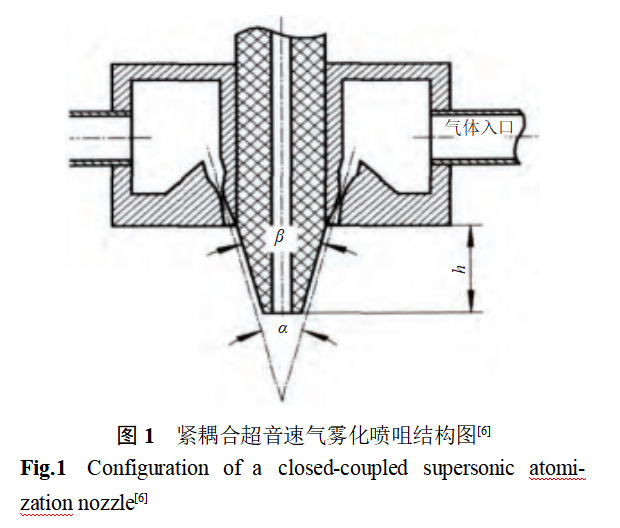 在熔炼工序采用真空感应熔炼装置大大减轻活泼元素Al、Y熔炼的控制难度,减少钢液吸氧和夹杂形成,中频感应炉的电磁搅拌有利于钢液在熔炼期和雾化过程的元素均质化。紧耦合超音速气雾化喷嘴结构如图1所示[6],其中α为喷嘴气流夹角,(°);β为金属导液管的锥顶角,(°);h为金属导液管的突出高度,mm。雾化时,导液管流出的钢液流与高速雾化气流紧密耦合,雾化气流动能转化为钢液滴表面能,在导液管下方形成“V”形气体回流区,有利于熔体成膜和初破碎,促进粉末产品细化。紧耦合气雾化技术与真空感应熔炼工艺组合应用,促使雾化粉末产品具有粒度小、球形度好、成分精准、元素分布均匀、低氧低夹杂等特点。