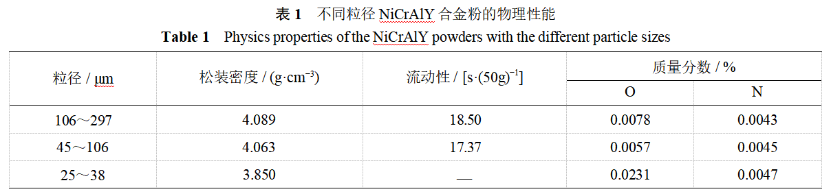 NiCrAlY合金粉的流动性、松装密度和微量元素O、N含量(质量分数)如表1所示。不同粒径粉末的松装密度与流动性明显不同,随粉末粒径减小,松装密度减少,粗中粒径粉末流动性相近且优良,而细粒径粉末流动性急剧恶化。松装密度不仅与合金材质有关,还与粉末形貌和聚集状态紧密相关。对粒径大的粉末,虽然颗粒间隙增大,但颗粒间粘附搭桥现象减少,单位体积内粉末累积间隙体积减小,致使松装密度增大;同理,当粒径小时,虽然颗粒间隙少,但颗粒间容易形成粘附搭桥,致使松装密度减小。当粉末具有较高的松装密度时,喷涂沉积速率高。粉末流动性受粉末形貌、颗粒表面状态、粒度组成等参数影响。同样,当颗粒间有粘附搭桥现象时,既阻碍粉末移动,颗粒表面也易吸附水分和气体,使流动性变差。流动性是影响喷涂过程送粉流畅性的关键参数,较好的流动性有利于喷涂时获得高质量涂层[1,6]。粉末含氧量是原料氧含量、冶炼雾化过程系统真空度以及后处理各工序参数控制状态等因素共同作用的结果。粗颗粒粉由于冷凝时间长,从环境吸氧较多,细颗粒粉由于颗粒总表面积大,总含氧量偏大。表1中不同粒径粉的含氧量也呈现这一规律,细粒径粉末含氧量数值最大,粗粒径次之,中粒径最低。从表1还可以看到,无论粉末粗细,氮含量几乎相同,较为稳定,这可能与氮是熔于固溶体内而非富集在颗粒表面相关。粉末中的O、N等杂质元素,通常会以MxOy或AluNv形式存在,热喷涂时会严重损害涂层结合强度、寿命等,因此粘结层合金粉要严格控制O、N含量。本文未采用氮气而选用高纯氩气为雾化介质,从粉末杂质含量来看,达到预期目的。