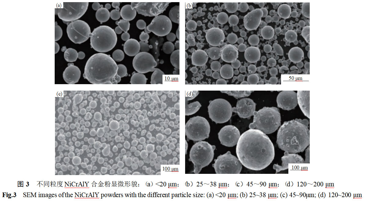 图3为不同粒度NiCrAlY合金粉的形貌。从图3可以看出,不论粒径大小,粉末主要由球形或近球形颗粒组成,均含有少量的异形颗粒。合金粉末粒度越细小,颗粒球形度越好,表面也越光滑。随粒径增大,粉末球形度变差,形貌更近泪滴状,颗粒表面褶皱突起和卫星颗粒增多,光滑度变差。