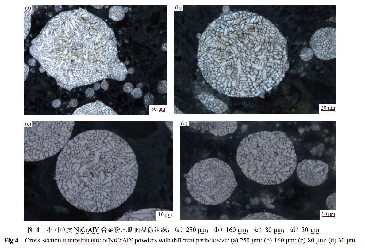 图4为不同粒度NiCrAlY合金粉末颗粒断面显微组织。粉末内部组织既反映了合金的凝固状态,也体现了凝固过程中合金的结晶和长大状况。从图4可以看出,粉末颗粒具有胞状晶和树枝晶两种典型组织,不同尺寸颗粒均为胞状晶+树枝晶的混合体。