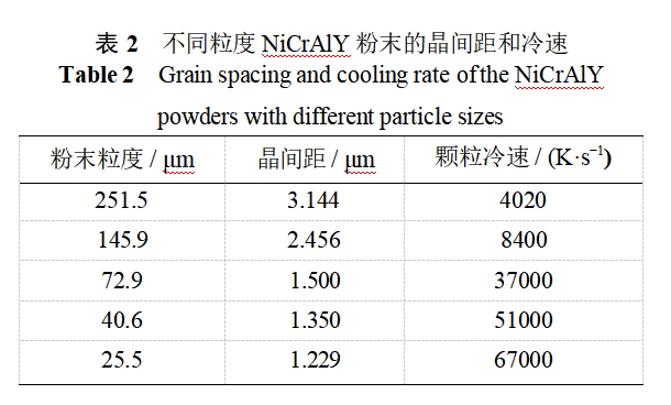 从图4还可看出,无论粉末粒径大小,截面边缘主要为胞状晶组织,树枝晶主要出现在靠近颗粒截面中间的位置,同时,粉末内部的胞状晶和树枝晶的晶粒尺寸都极不均匀。熔滴冷却速度是影响粉末内部组织的关键参数。金属熔滴的凝固是一个高温高速过程,涉及从液态熔体到固态的转变,直接测量熔滴冷凝速度是相当困难的,通常采用间接法推导。二次树枝晶臂距与冷却速率之间的关系为λ=b·T−n,其中λ为二次枝晶臂距,μm;T为冷却速率,K·s−1;b为修正常数,μm·(K·s?1)n;n取值为1/3~1/2[10]。采取“截线法”[11],在图4中随机量取6~8个胞晶或枝晶间距,取测量值的平均值作为晶间距,取b=50μm·(K·s?1)n,n=0.33,推导颗粒冷速。不同尺寸颗粒的晶间距和冷速数据见表2所示。